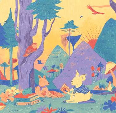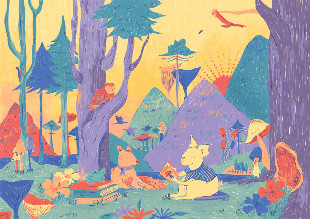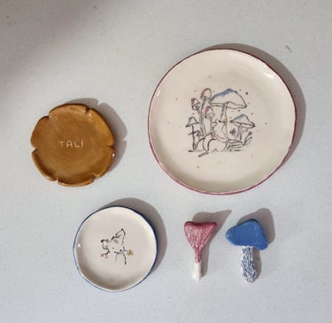 Ilustración mágica para decorar la habitación de Tali, acompañada por una serie de platos de cerámica hechos a mano para colgar en la pared.